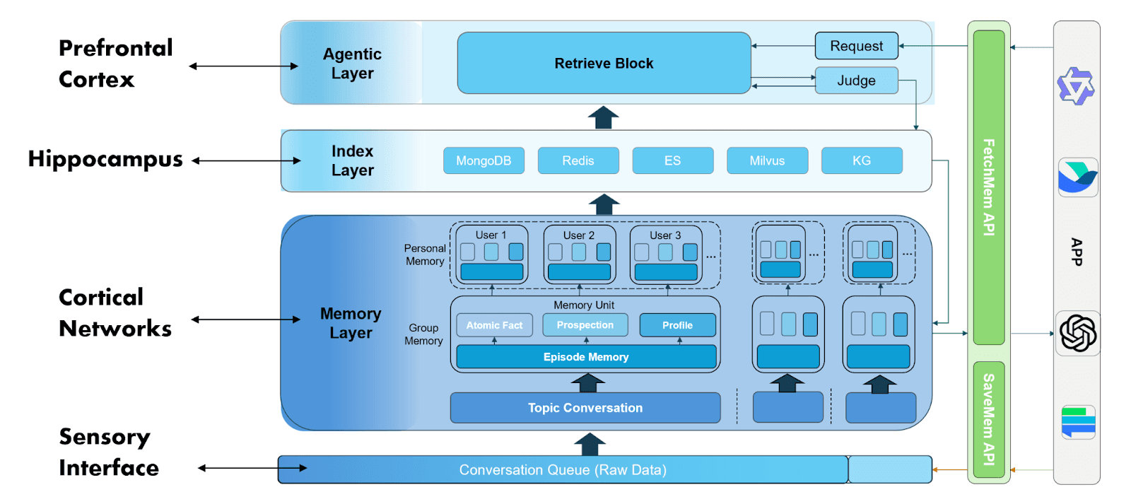 我们认为,长期记忆系统不应只是一个向量数据库,而应是一个动态演化的“认知操作系统”。这种理解源于对人类智力机制的模拟。