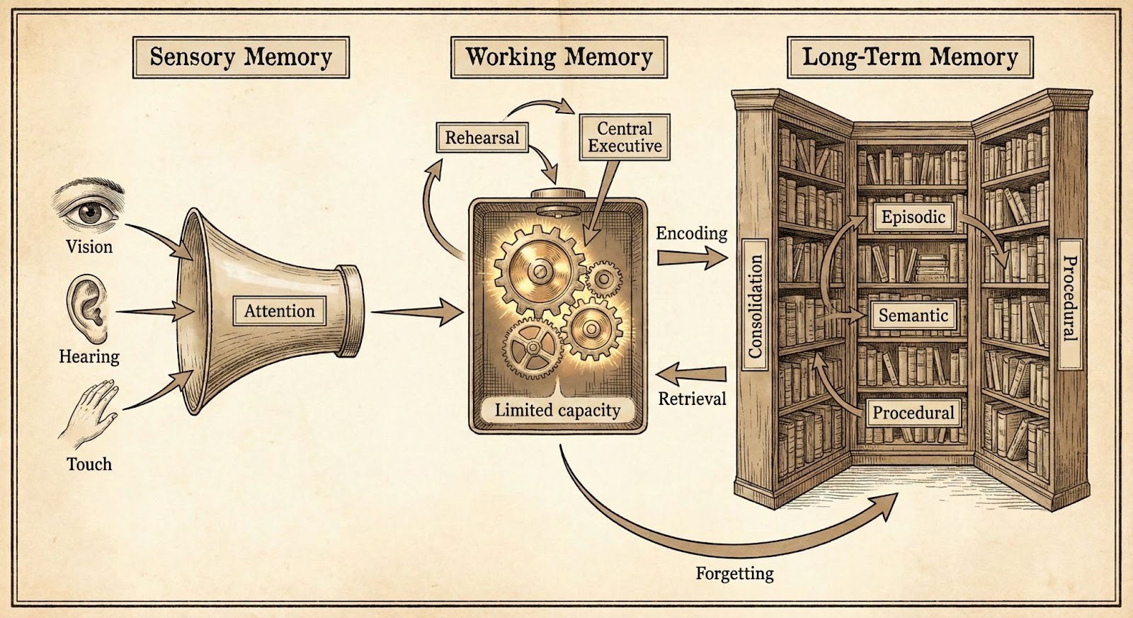 [图示:人类记忆系统示意图 - Sensory / Working / Long-Term Memory]