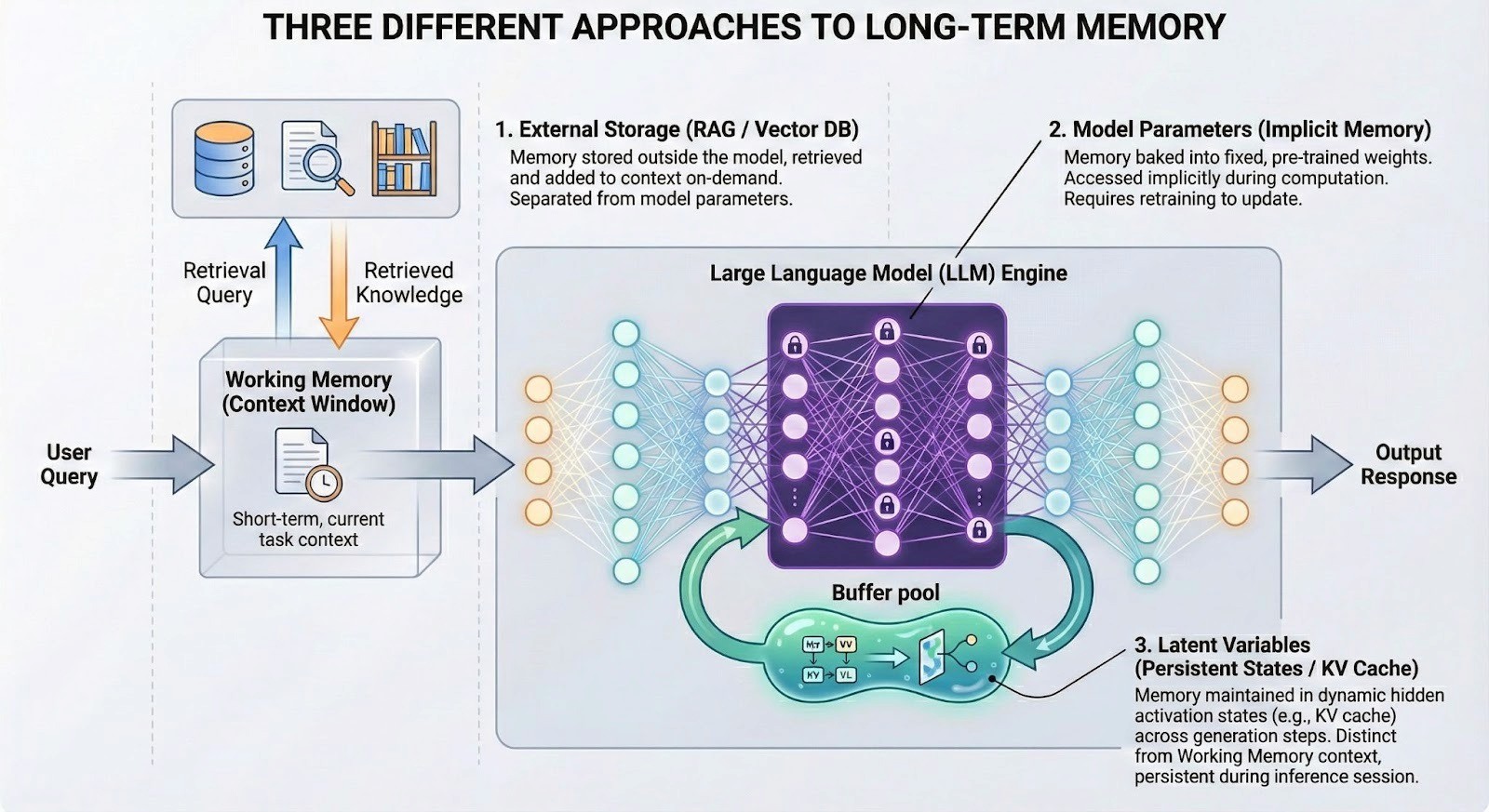 [图示:AI 长期记忆系统三种路径复合架构图 (External Storage / Model Parameters / Latent Variables)]
