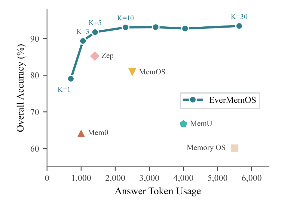 在行业主流的长期记忆 Benchmark 数据集 LoCoMo 上,EverMemOS 以较低的 Token 消耗取得了超越同期竞品的准确率。